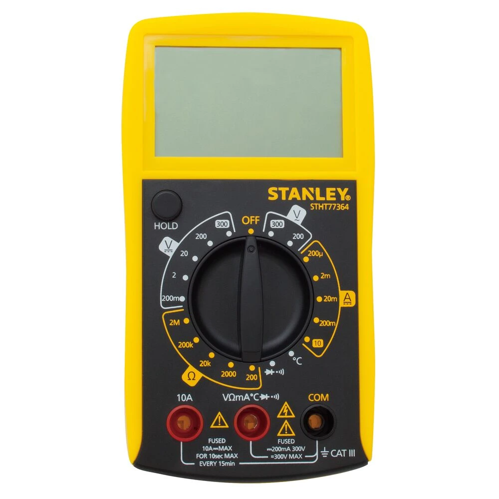 Featuring 7 functions and 20 ranges, the STANLEY® Multi-Meter is designed to meet Category 3 standards CAT III. The LCD screen with large numbers ensures easy readability, while the rugged over molded housing provides shock resistance. With a frequency range of 40Hz-400Hz, this multi-meter can test different types of batteries and offers voltage, continuity, current, diode check, and resistance functions. It operates on a single 9V battery, making it a reliable tool for a range of tasks.